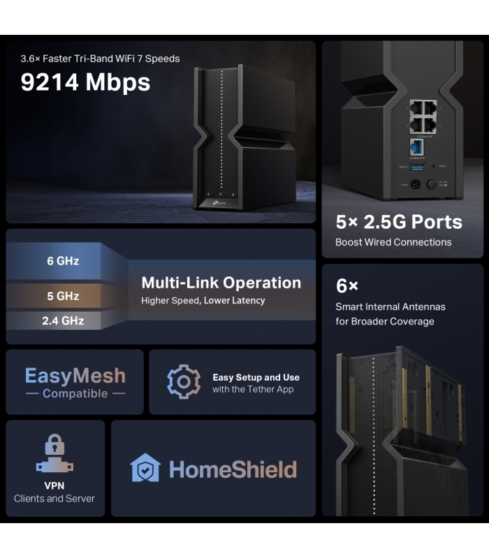 Multi-Link Operation (MLO)320 MHz kanaal4K-QAMMulti-RU'sEasyMesh-compatibelWerkt met Alexa en Google AssistantIoT-netwerk